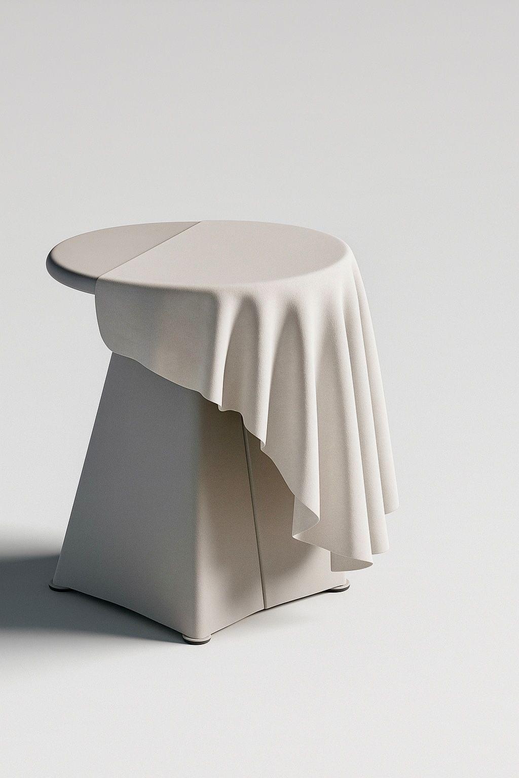 Mathieu Lehanneur poursuit ici sa recherche d’un arrêt sur image et d’une mise en suspension du temps. Il fige dans la matière ce qui n’a pas vocation à perdurer. L’œuvre repose sur un jeu de contrastes : la stabilité du métal dialogue avec un drapé en céramique plié à la main, dont la délicatesse suggère un tissu prêt à se dérober.