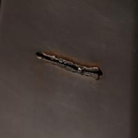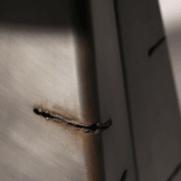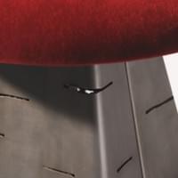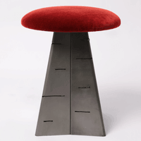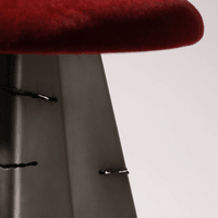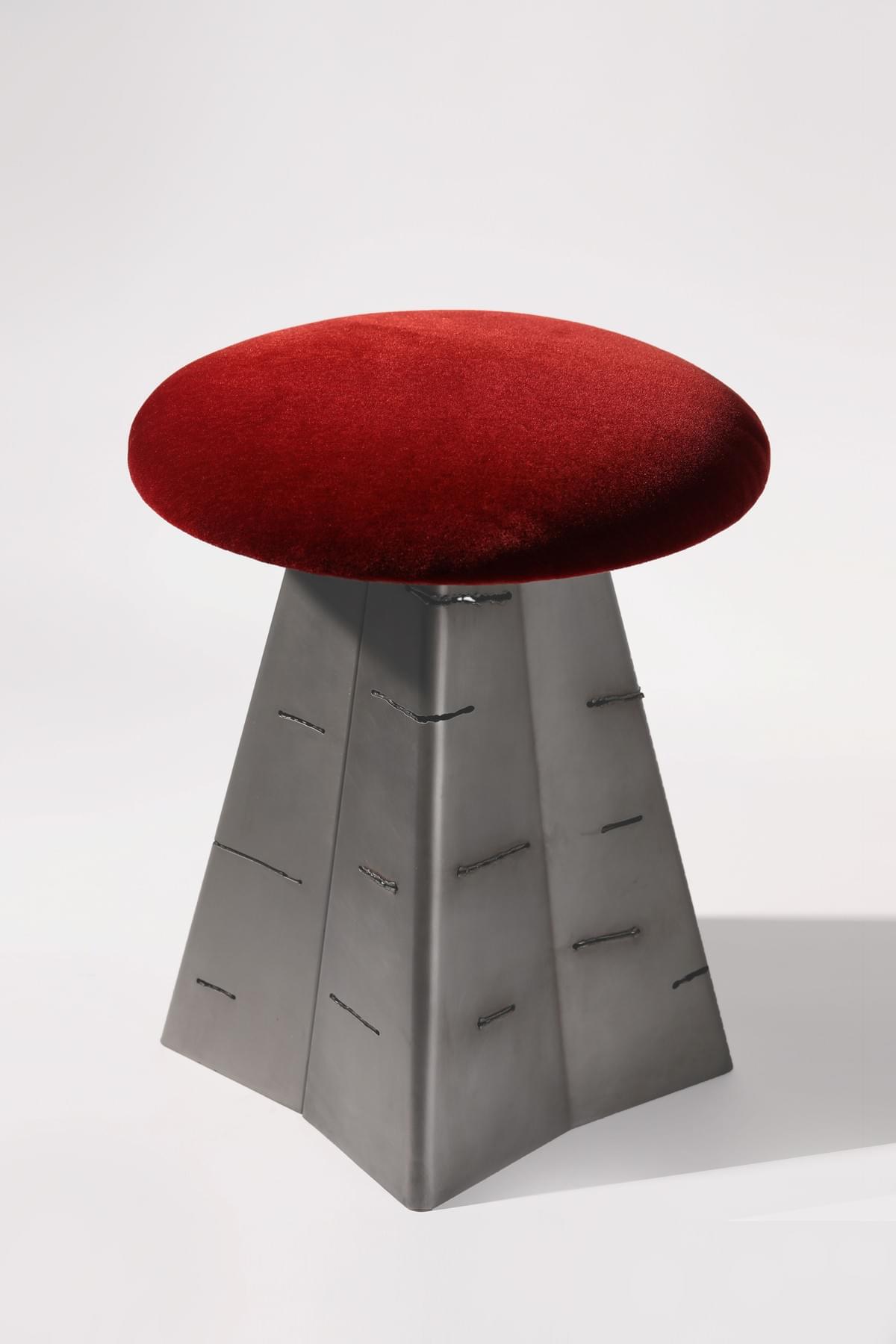 Face à la rigueur du dessin original : la scarification du métal, aux incisions évoquant Lucio Fontana où la brutalité du geste et de la matière dialogue avec la douceur du velours de mohair. Une tension entre violence contenue et sensualité assumée.