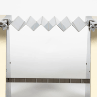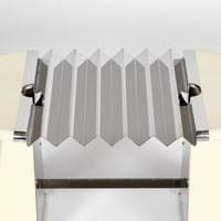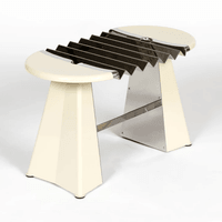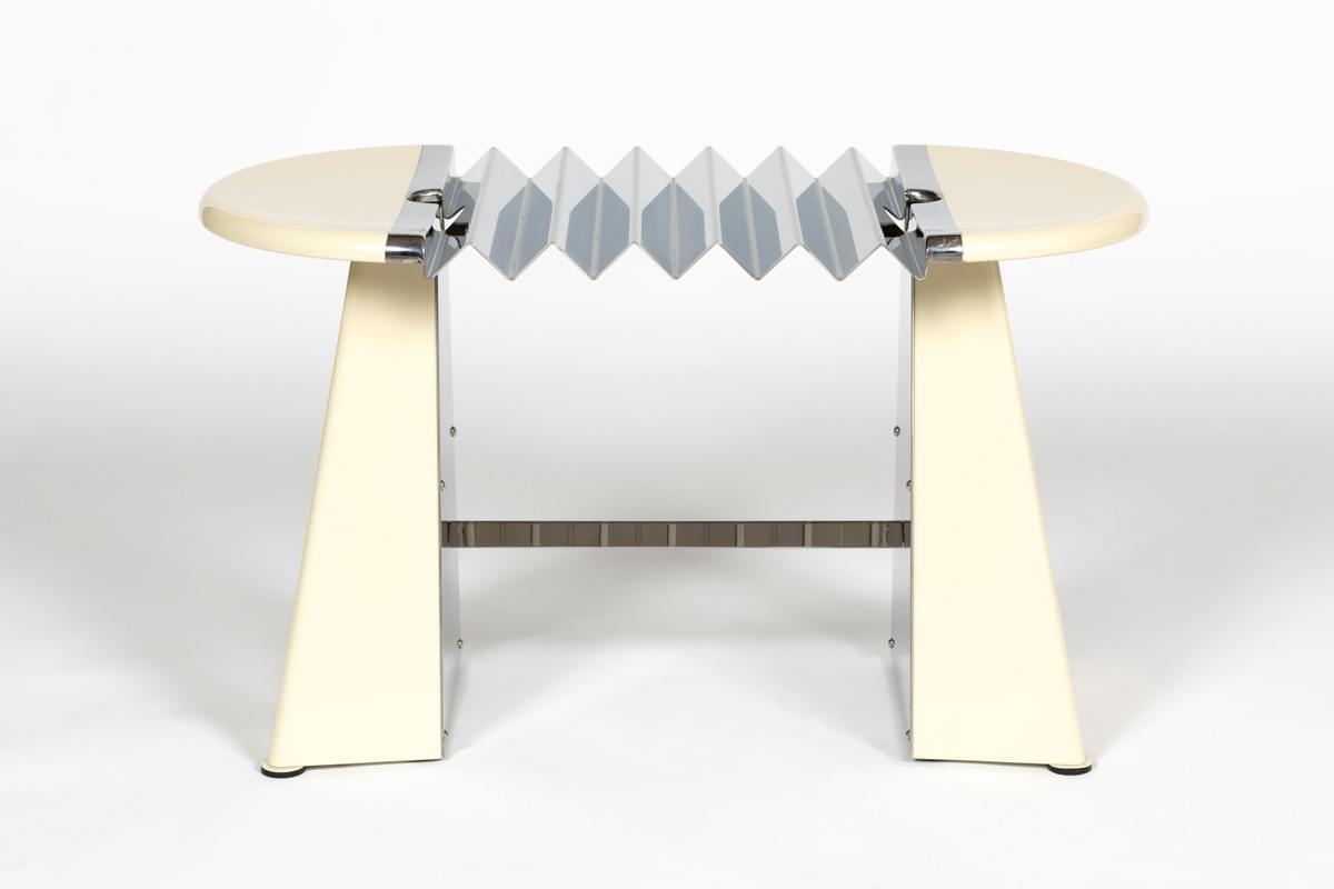 En l’ouvrant selon son axe, le tabouret s’est déployé tel un éventail métallique, révélant en son cœur une tôle polie miroir. Ces facettes éclatantes introduisent un jeu de reflets qui contraste avec la rigueur géométrique de la pièce et en révèle la part de légèreté et de facétie.