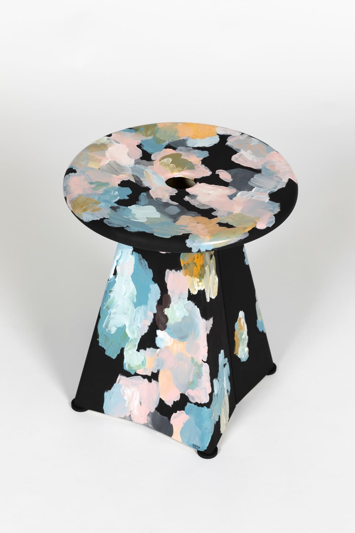 Utilisé comme une véritable palette, Le Tabouret du peintre raconte les coulisses de l’artiste. Objet silencieux mais chargé de vie, il devient la mémoire concrète de l’atelier, un témoin de la peinture avant qu’elle ne devienne tableau. Sur sa surface, les couches se superposent.