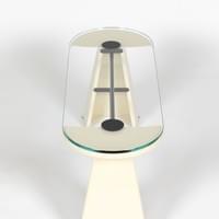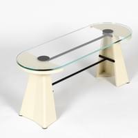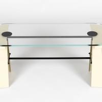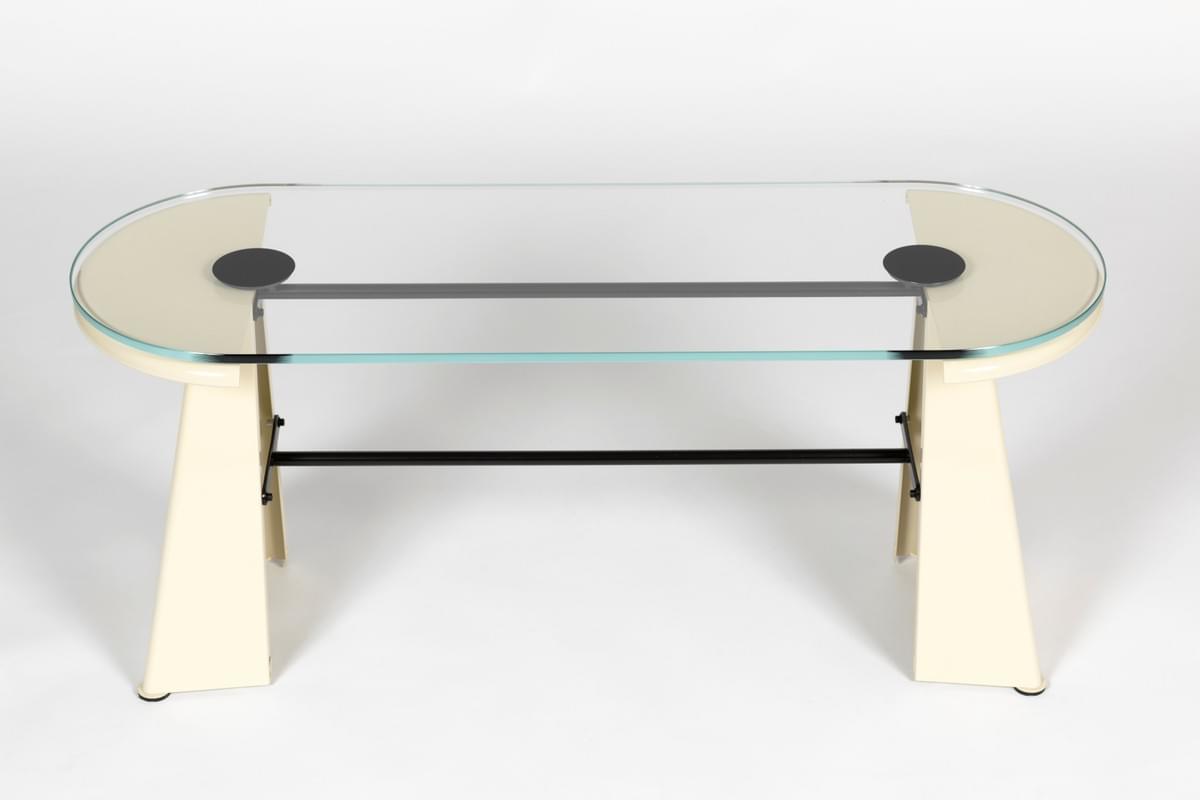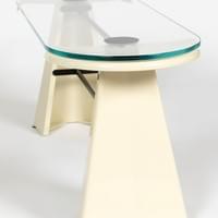 Métal, serrurerie fine (par le ferronnier d’art VLD), et plateau en verre sérigraphié (verrier Ferraris),