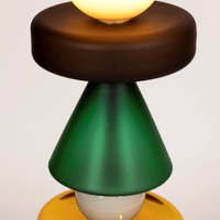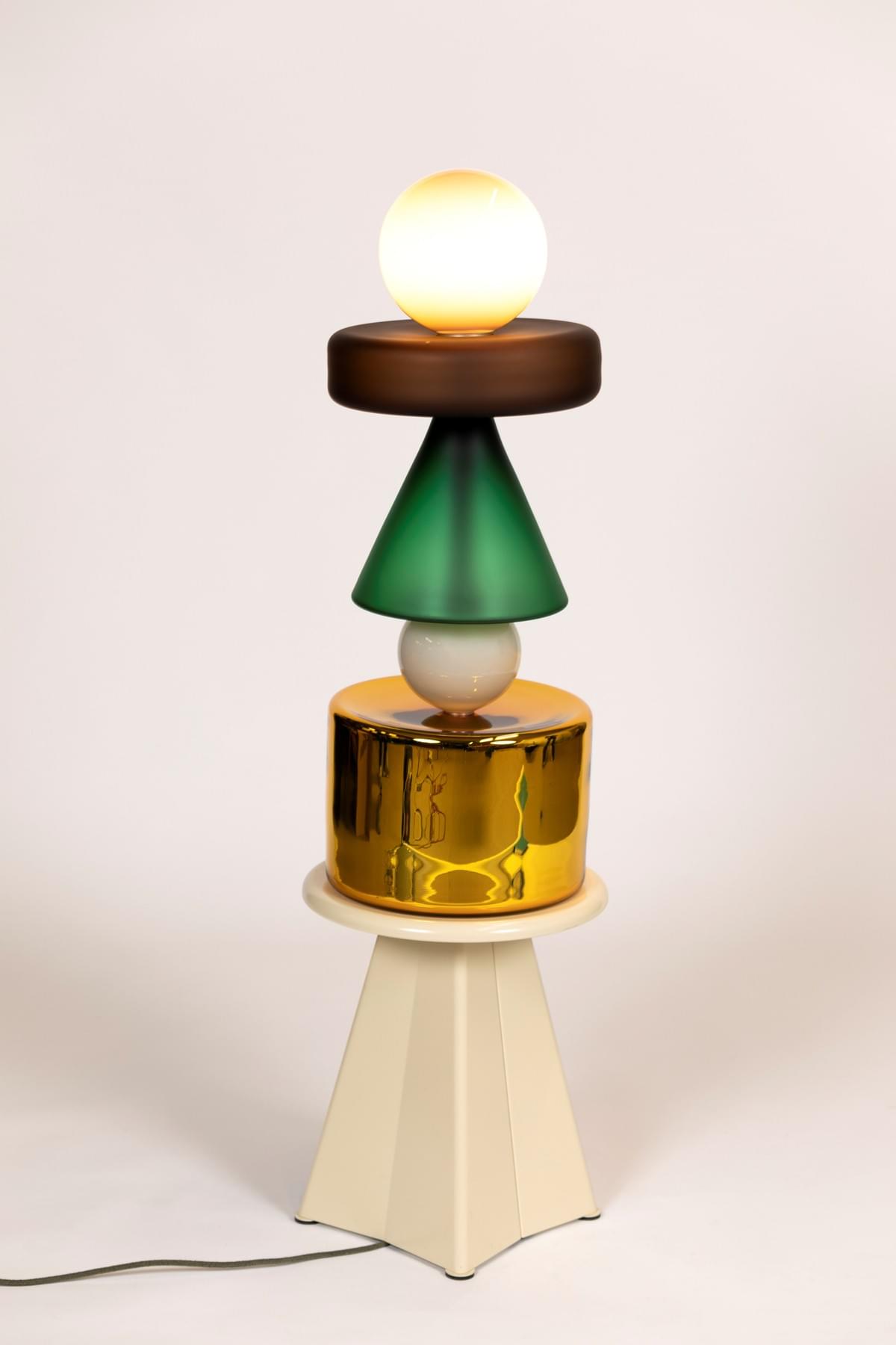 Cinq formes géométriques s’élèvent en équilibre sur le Tabouret Métallique de Jean Prouvé, prolongeant ses lignes à la fois rondes et anguleuses.