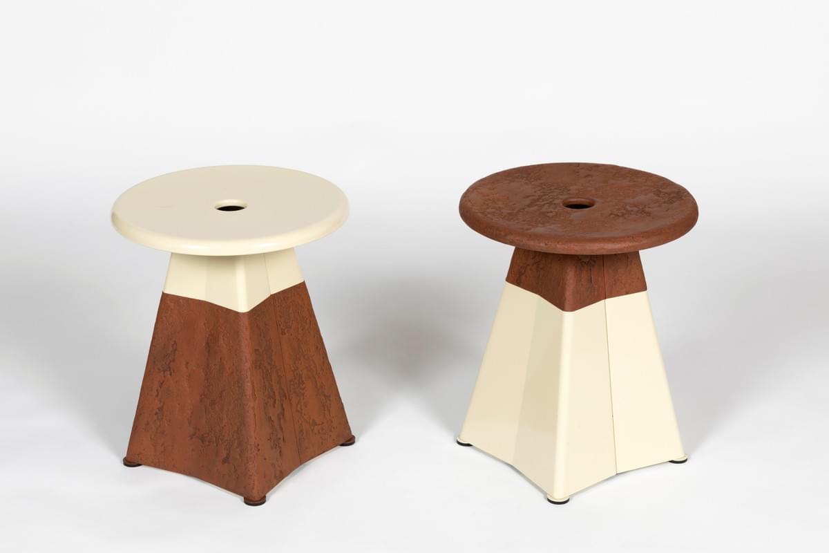 Deux tabourets travaillés en miroir, comme une réflexion sur le passage du temps. L’un se transforme là où l’autre demeure. Ce dialogue entre transformation et préservation évoque le temps qui façonne, altère ou révèle, dans un équilibre entre ce qui change et ce qui reste.
